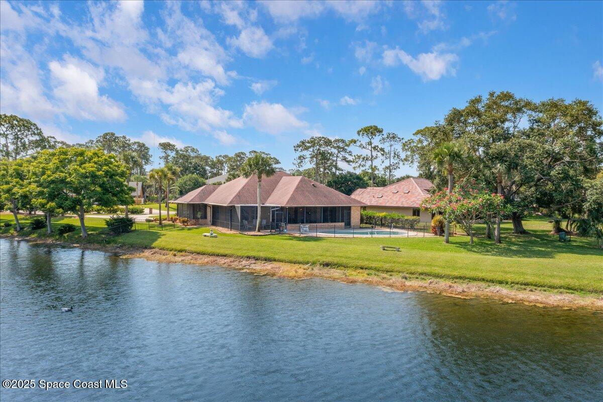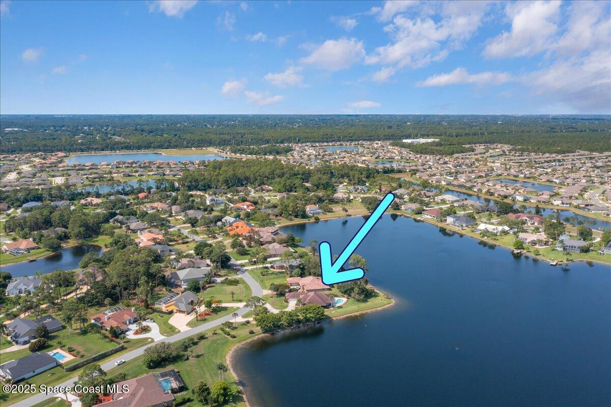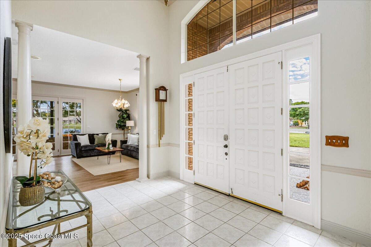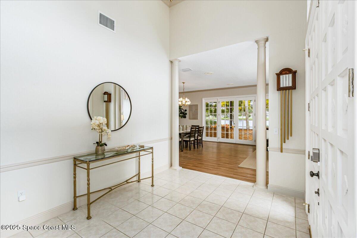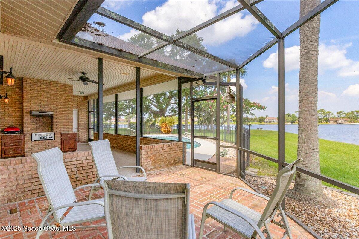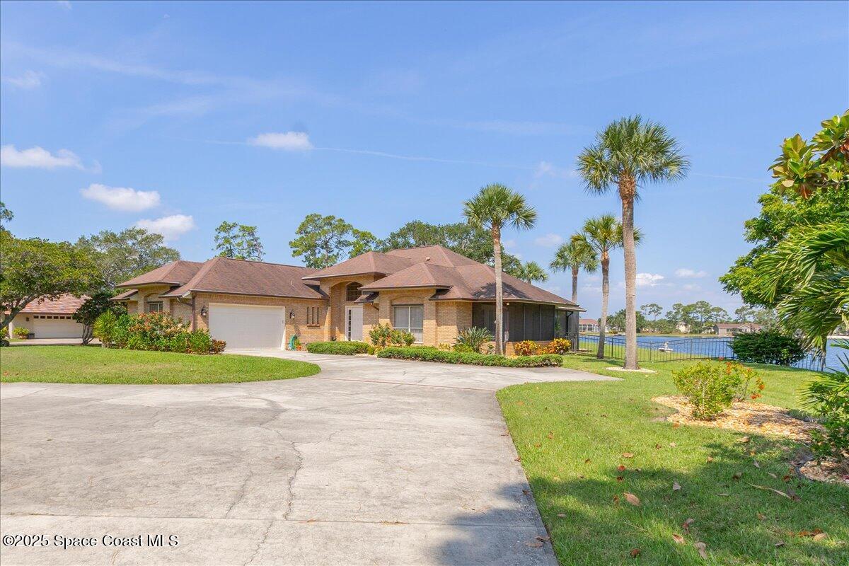 Exceptional custom-built pool home by East Coast Craftsman in prestigious Carriage Gate! This 3 bed, 2 full + 2 half bath residence offers 2,563 sq. ft. of living space on a .54-acre lakefront lot with panoramic views. Solid concrete block construction with a full brick exterior ensures timeless durability & curb appeal. The soaring 16' foyer & 10' ceilings with 8' doors create a grand, open feel. The gourmet kitchen features quartz & granite counters, new appliances, abundant storage & views of the pool & lake. The spacious primary suite includes double sliders to the patio, a walk-in closet, & a spa bath with dual vanities, walk-in shower, and garden tub. Executive finishes include crown molding, tiled floors, and a Jack-n-Jill bath for guest rooms. Outdoor living shines with a resurfaced pool (2016), summer kitchen, half pool bath, and an extended brick-paver patio. A circular drive & central vac complete this extraordinary property in an A-rated school district near shopping