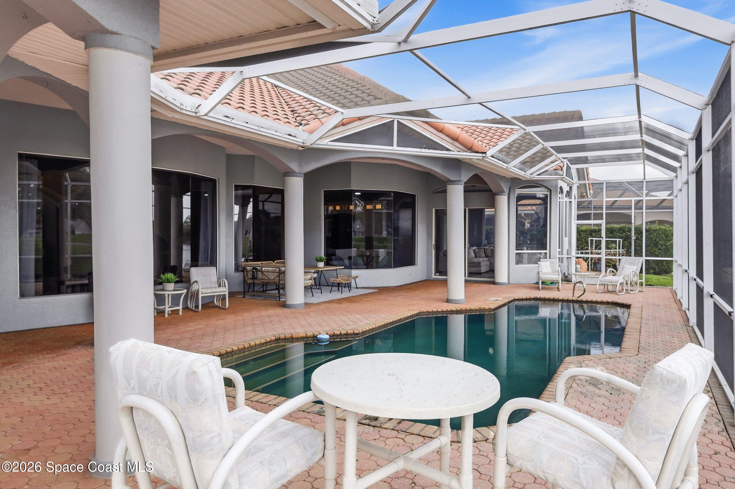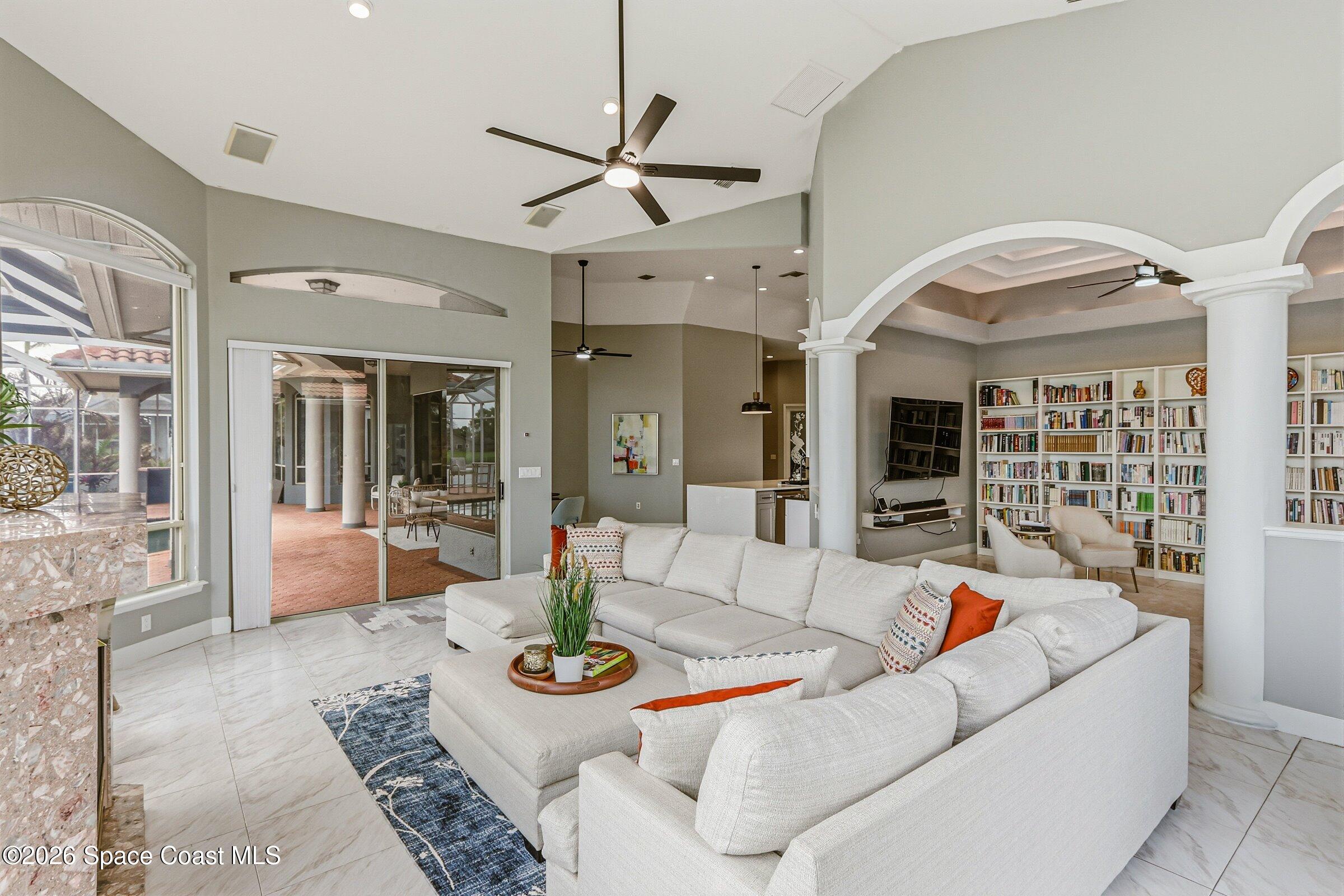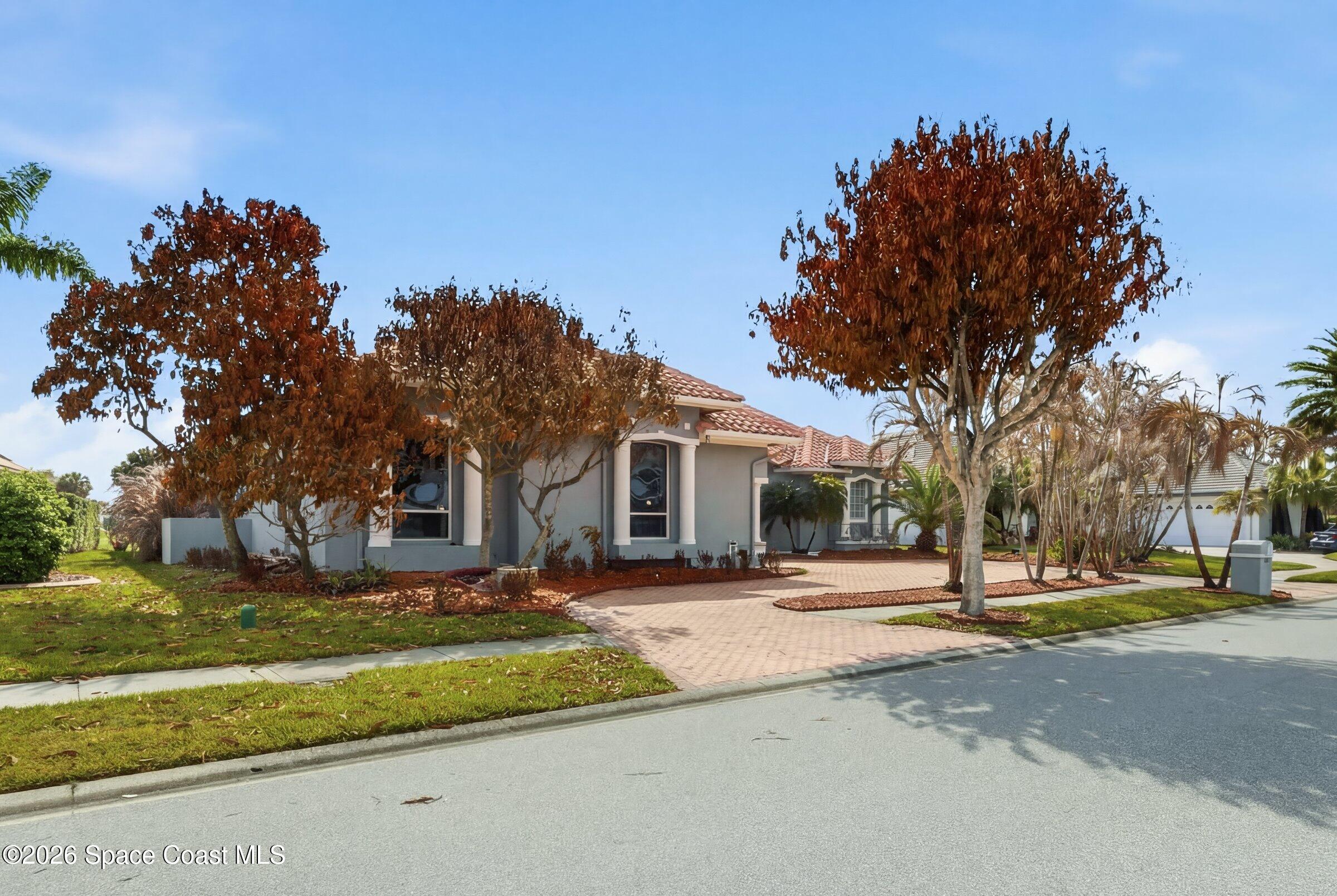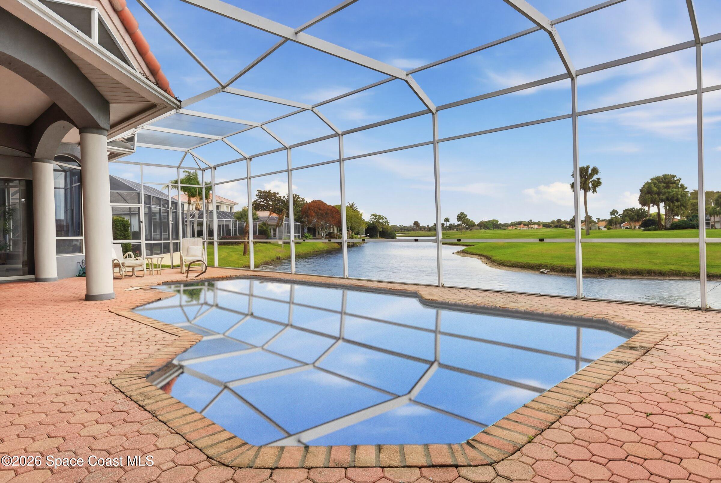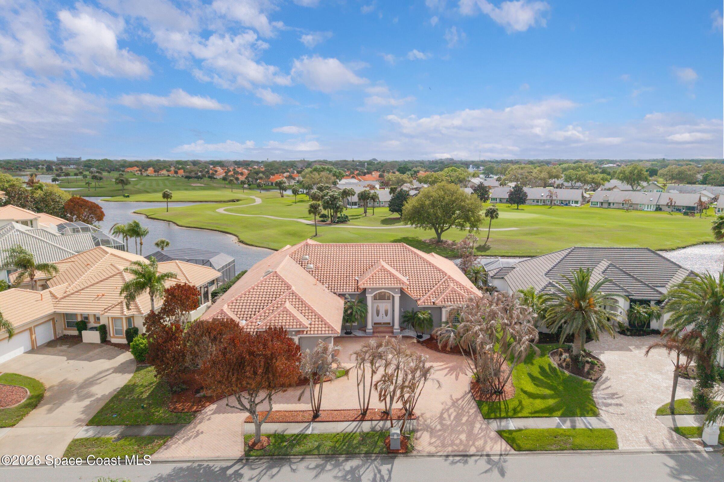 Discover an extraordinary lakefront estate in the Legends at Suntree. Offering 4,449sq ft of refined living space with sweeping views of Arnold Palmer Challenge Golf course.5 bedroom 3.5 bath residence blends grand scale with elegant design. Beginning with a dramatic 16' foyer and soaring 12-14' ceilings throughout accented by tray ceilings in the primary suite, living, family and dining rooms this home is designed for both sophisticated entertaining and everyday comfort. The home features a private library, media room and open living flow that captures stunning water and fairway vistas. The chef kitchen is beautifully appointed with quartz countertops a striking waterfall island and GE Cafe appliances. The luxurious primary suite offers a slipper tub, oversized walk-in shower and expansive his and hers closets. Outdoors a resort style pool and screened lanai overlook the tranquil lake and golf course scenery, completing this exceptional three-car garage estate.