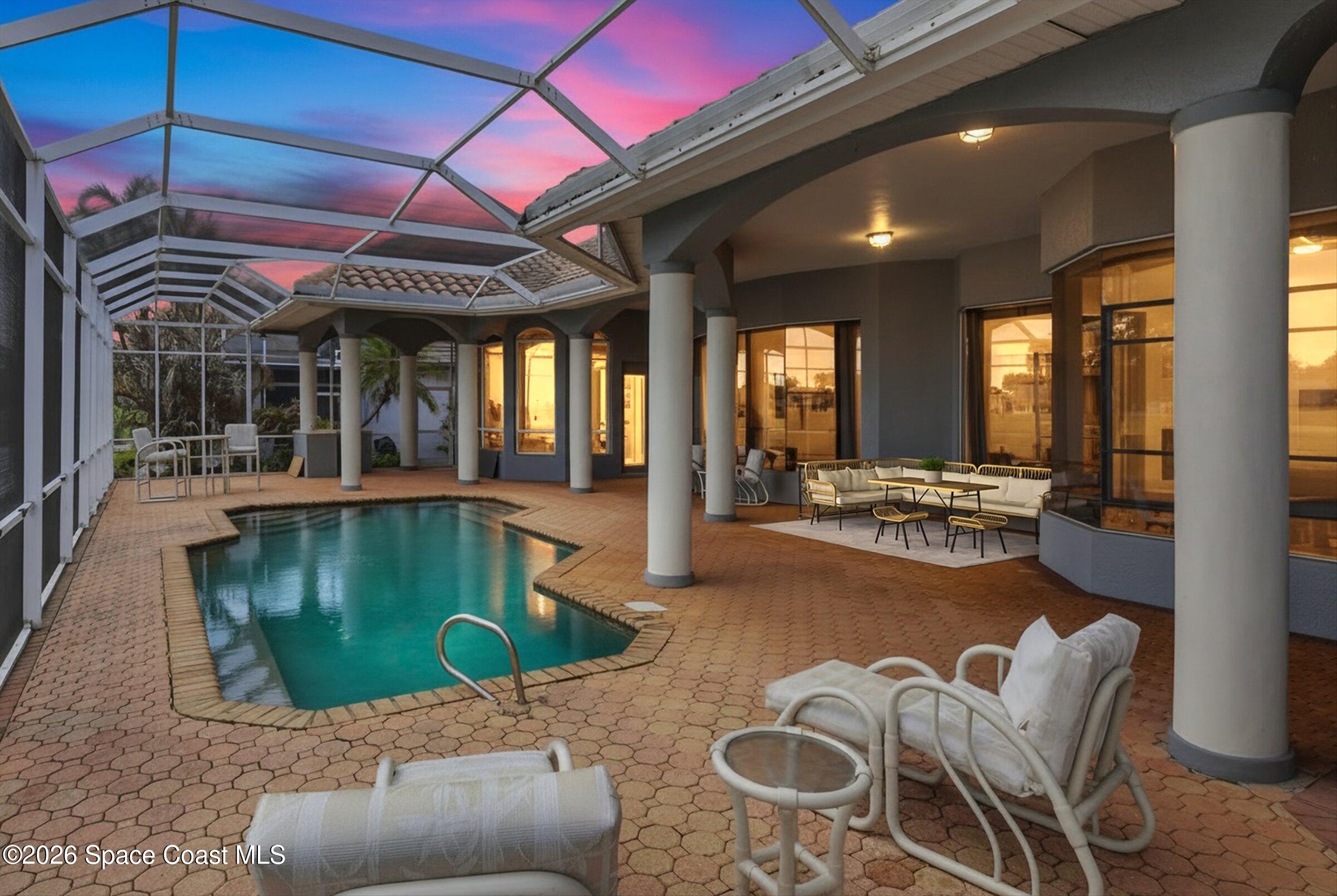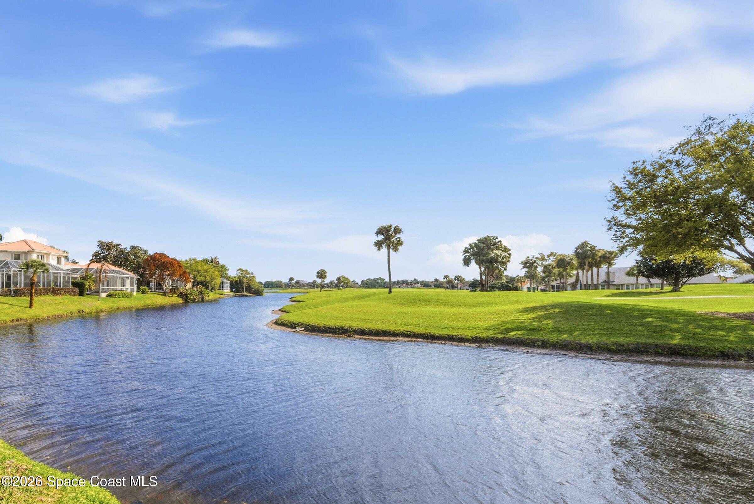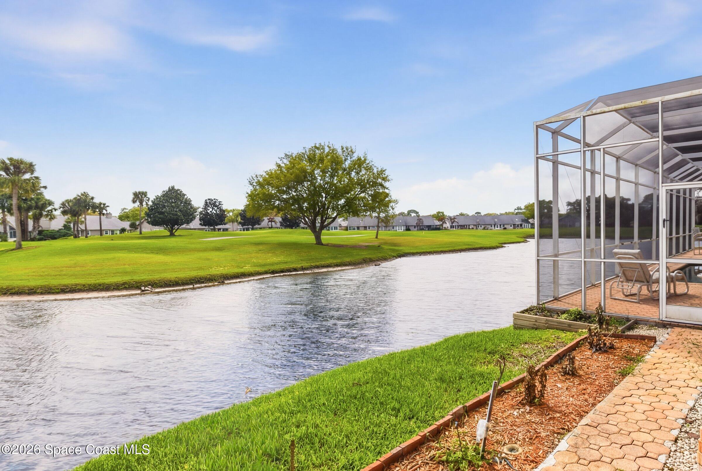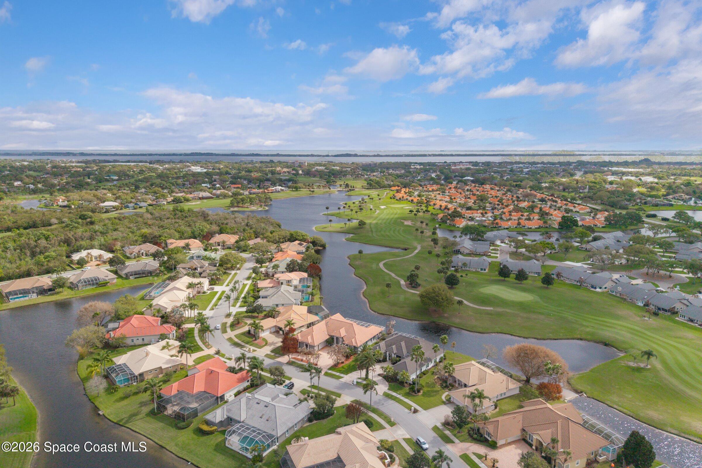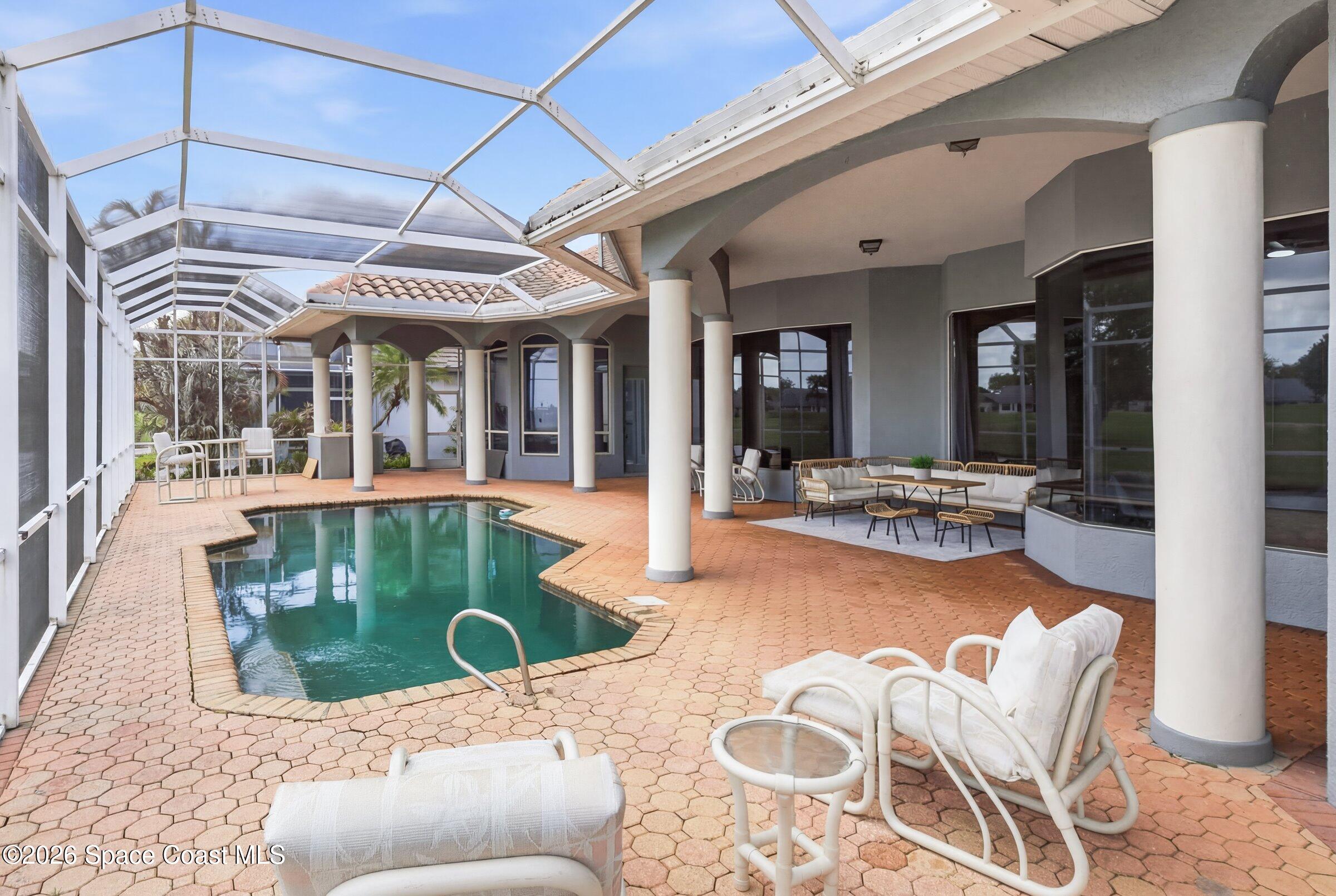 Discover an extraordinary lakefront estate in the Legends at Suntree. Offering 4,449sq ft of refined living space with sweeping views of Arnold Palmer Challenge Golf course.5 bedroom 3.5 bath residence blends grand scale with elegant design. Beginning with a dramatic 16' foyer and soaring 12-14' ceilings throughout accented by tray ceilings in the primary suite, living, family and dining rooms this home is designed for both sophisticated entertaining and everyday comfort. The home features a private library, media room and open living flow that captures stunning water and fairway vistas. The chef kitchen is beautifully appointed with quartz countertops a striking waterfall island and GE Cafe appliances. The luxurious primary suite offers a slipper tub, oversized walk-in shower and expansive his and hers closets. Outdoors a resort style pool and screened lanai overlook the tranquil lake and golf course scenery, completing this exceptional three-car garage estate.