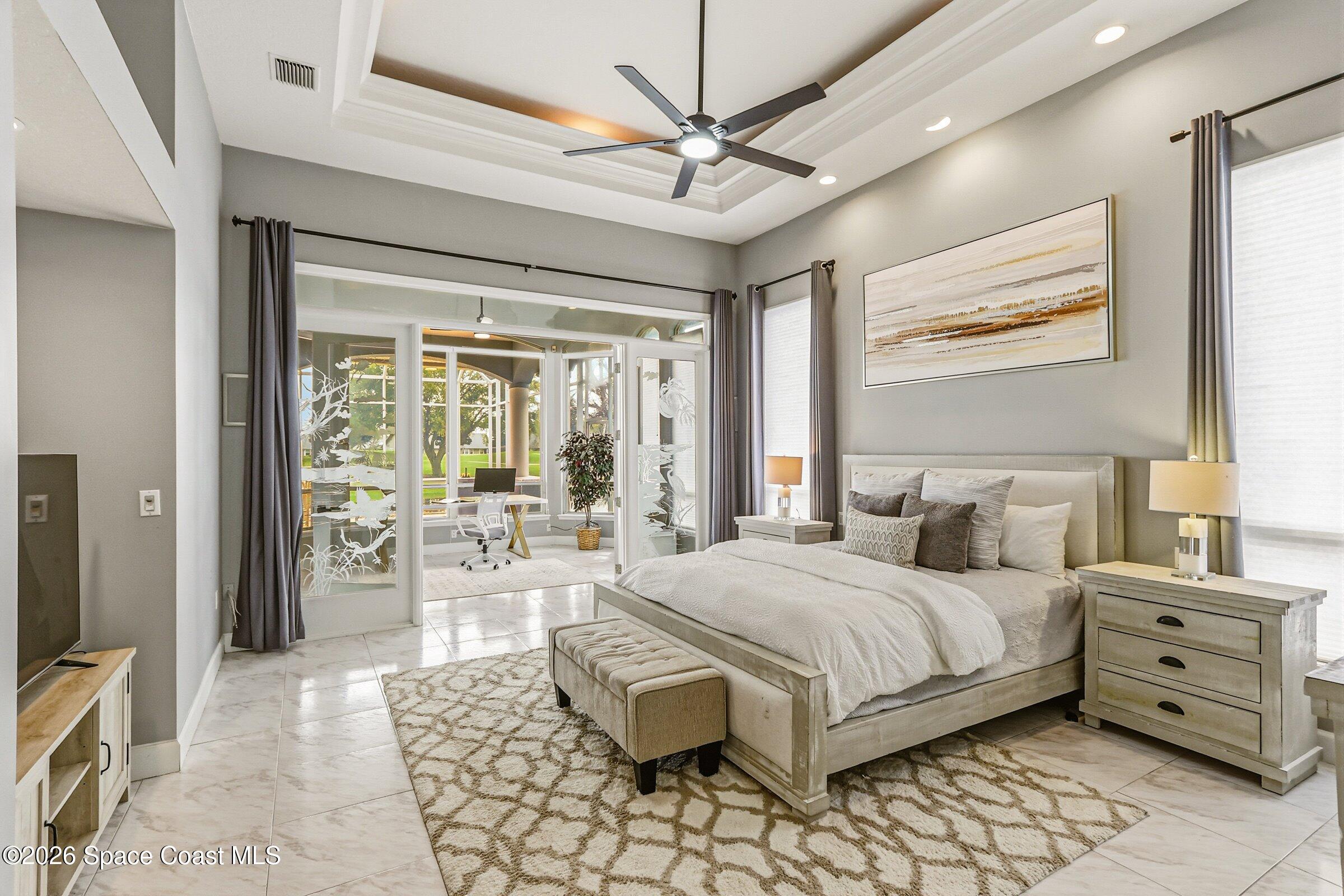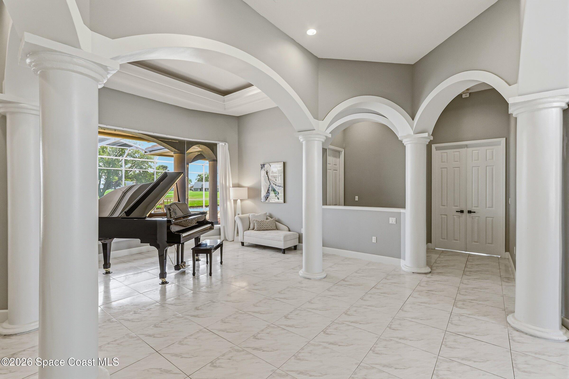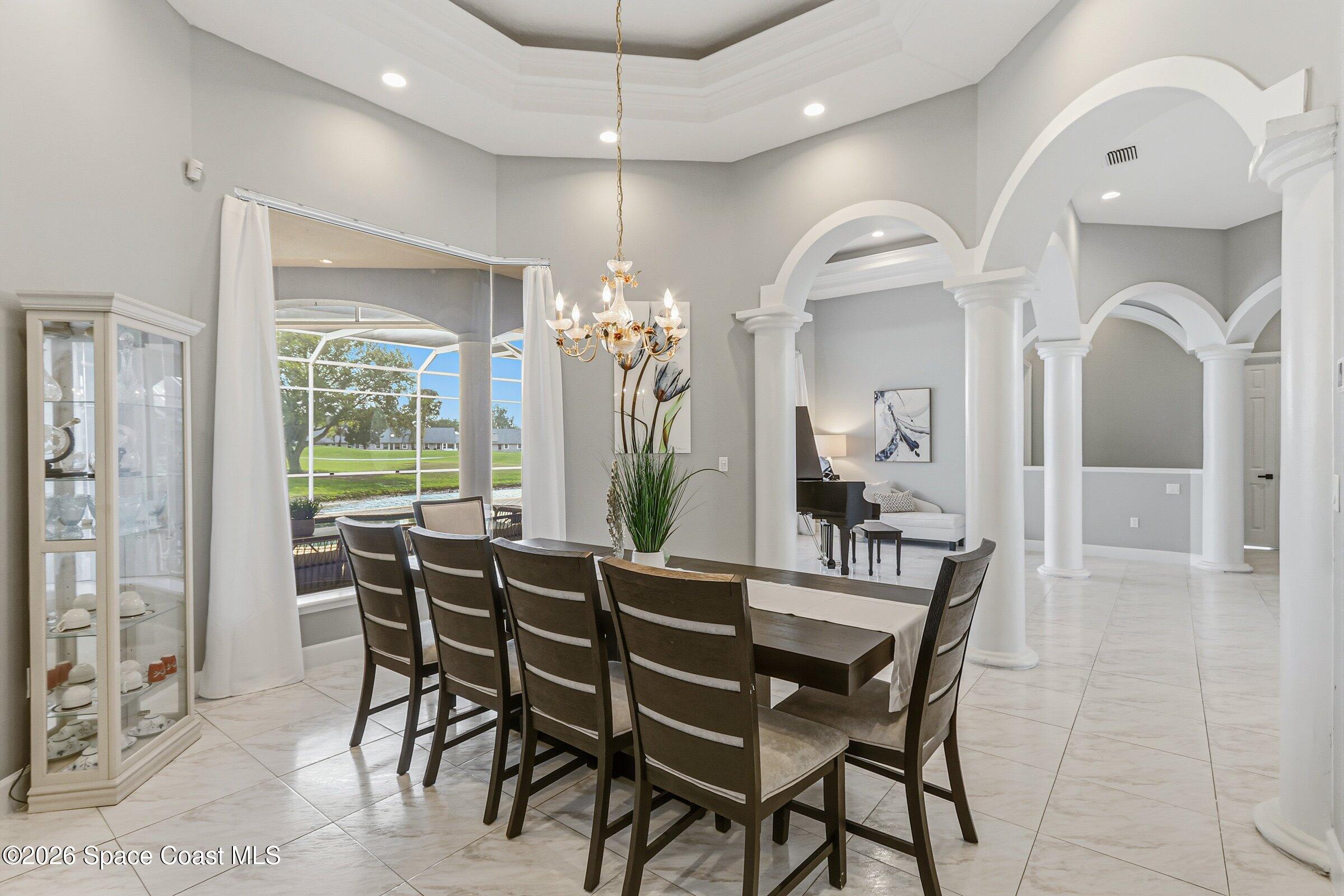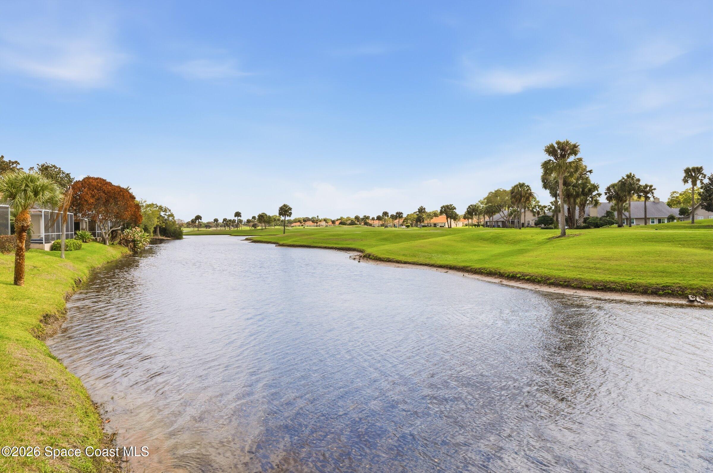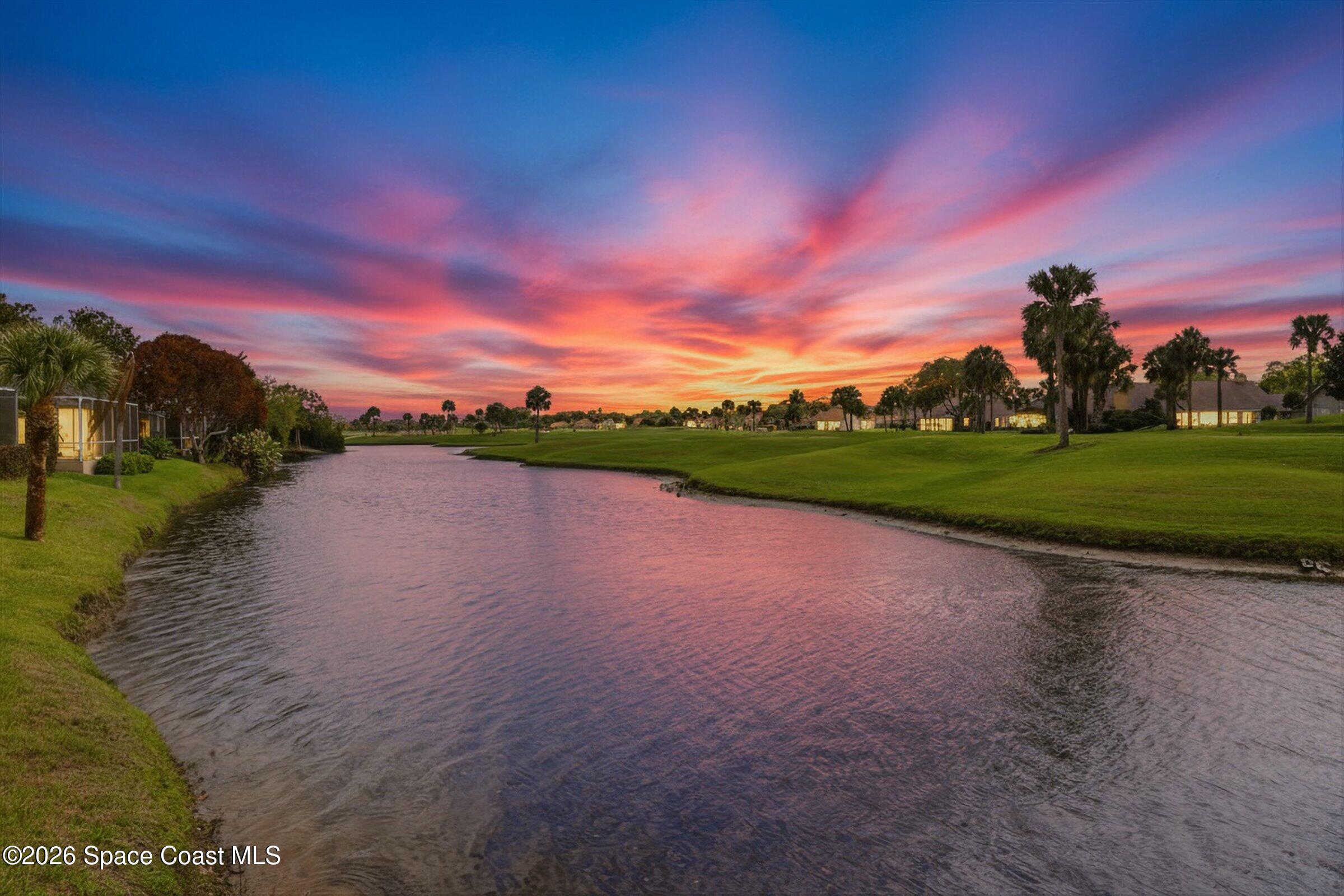 Discover an extraordinary lakefront estate in the Legends at Suntree. Offering 4,449sq ft of refined living space with sweeping views of Arnold Palmer Challenge Golf course.5 bedroom 3.5 bath residence blends grand scale with elegant design. Beginning with a dramatic 16' foyer and soaring 12-14' ceilings throughout accented by tray ceilings in the primary suite, living, family and dining rooms this home is designed for both sophisticated entertaining and everyday comfort. The home features a private library, media room and open living flow that captures stunning water and fairway vistas. The chef kitchen is beautifully appointed with quartz countertops a striking waterfall island and GE Cafe appliances. The luxurious primary suite offers a slipper tub, oversized walk-in shower and expansive his and hers closets. Outdoors a resort style pool and screened lanai overlook the tranquil lake and golf course scenery, completing this exceptional three-car garage estate.