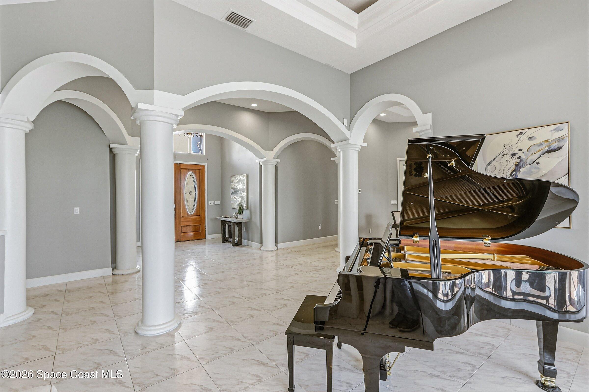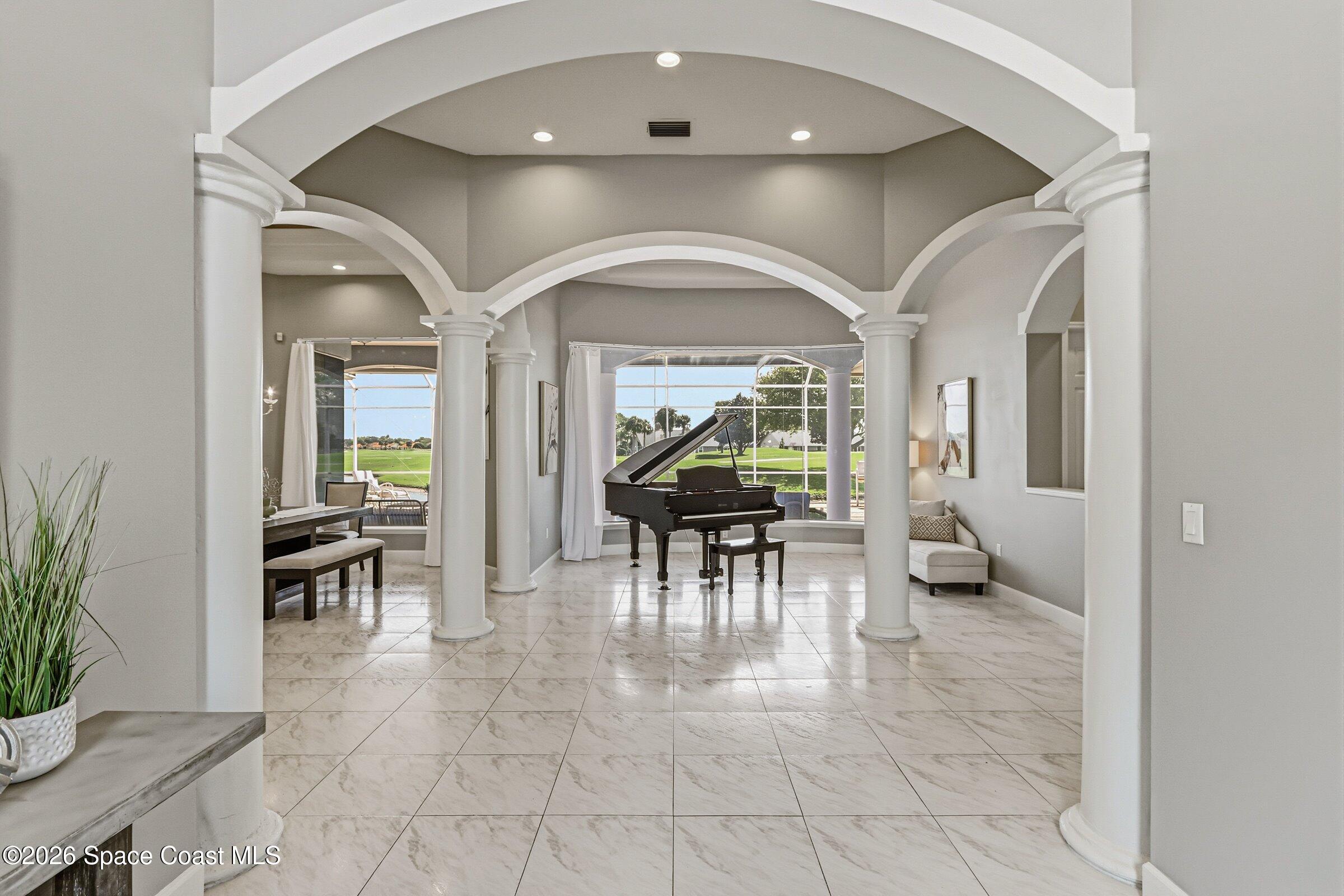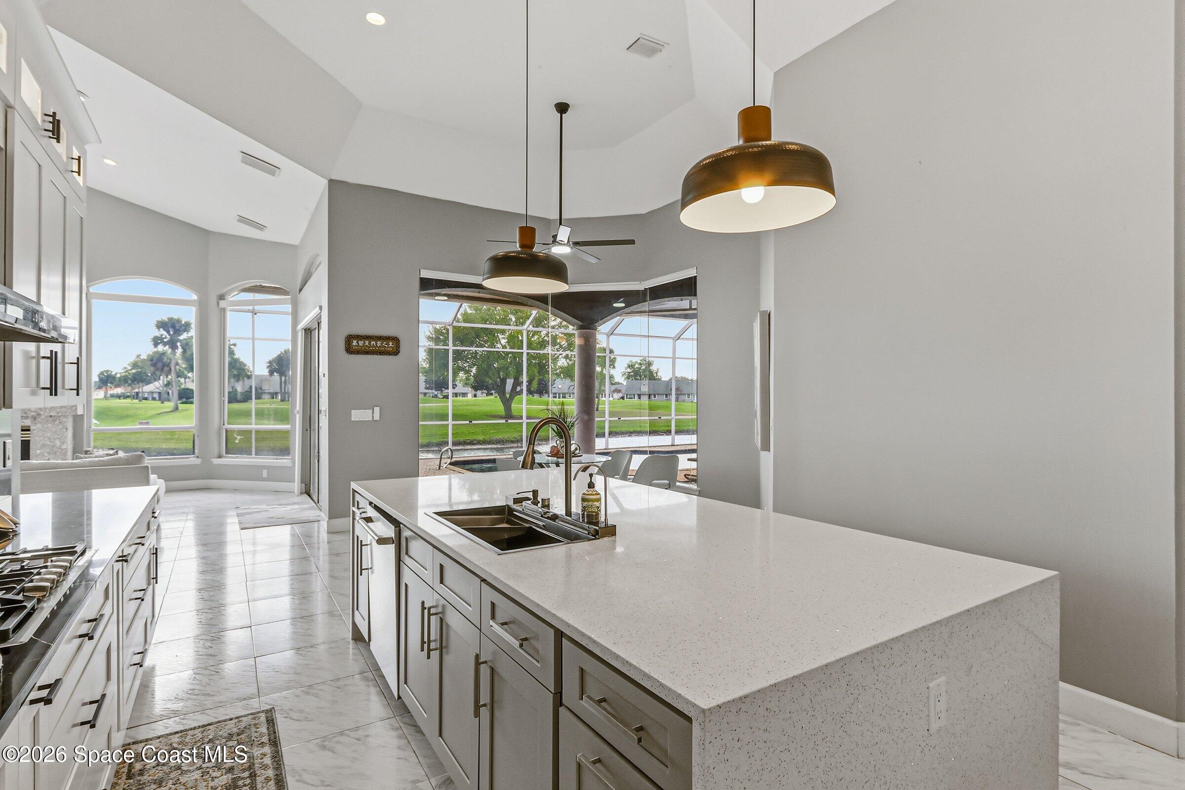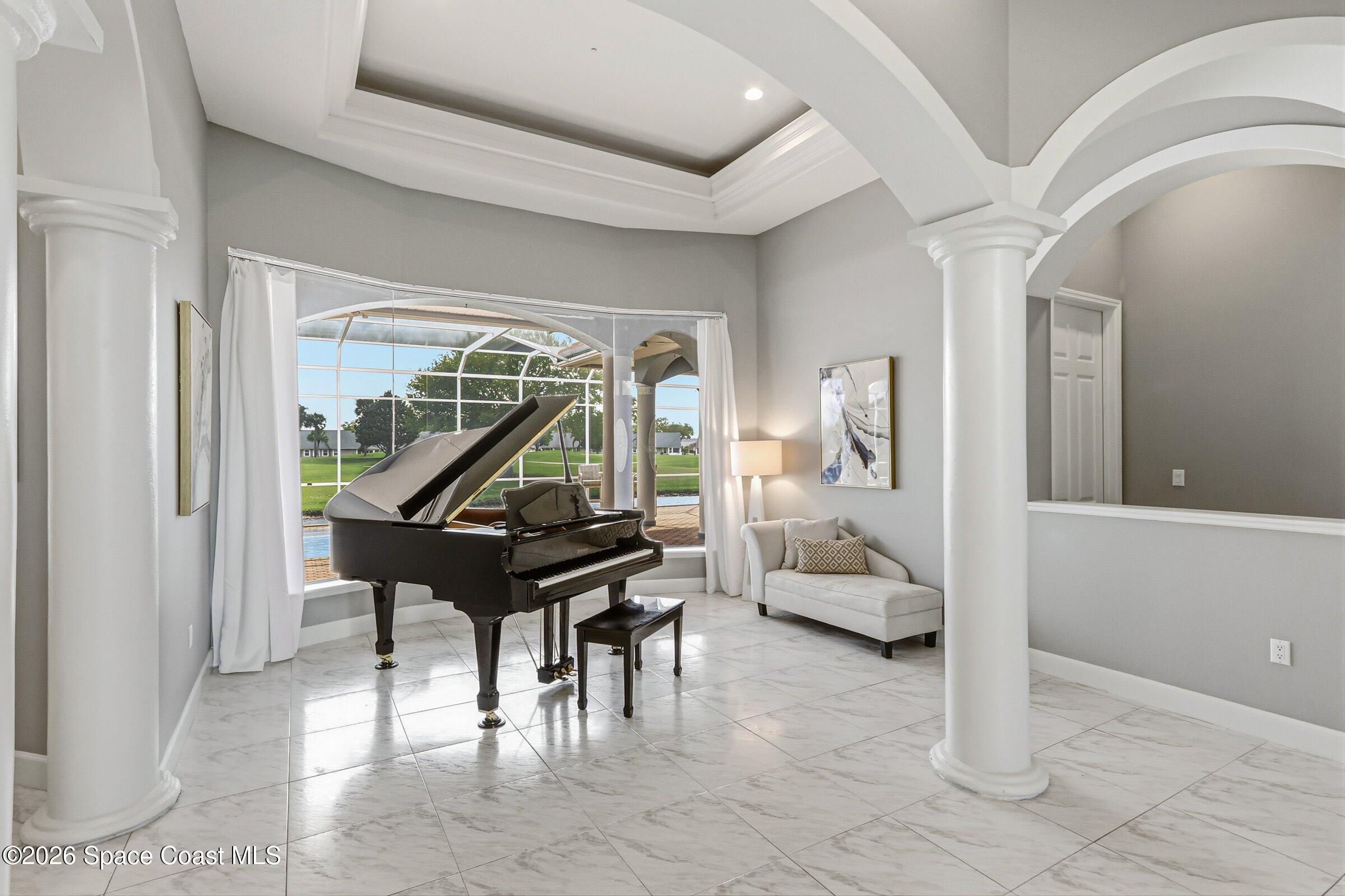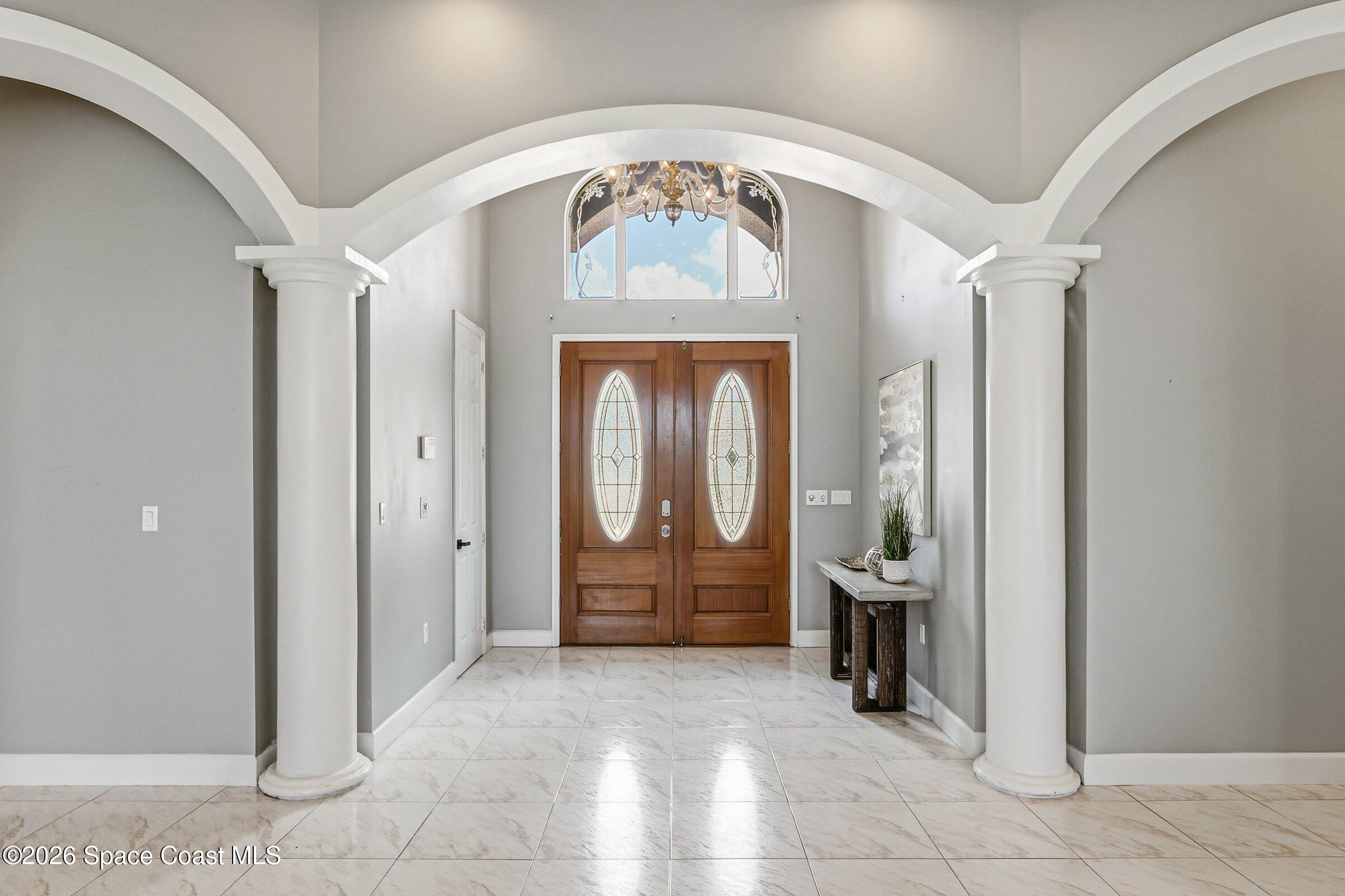Discover an extraordinary lakefront estate in the Legends at Suntree. Offering 4,449sq ft of refined living space with sweeping views of Arnold Palmer Challenge Golf course.5 bedroom 3.5 bath residence blends grand scale with elegant design. Beginning with a dramatic 16' foyer and soaring 12-14' ceilings throughout accented by tray ceilings in the primary suite, living, family and dining rooms this home is designed for both sophisticated entertaining and everyday comfort. The home features a private library, media room and open living flow that captures stunning water and fairway vistas. The chef kitchen is beautifully appointed with quartz countertops a striking waterfall island and GE Cafe appliances. The luxurious primary suite offers a slipper tub, oversized walk-in shower and expansive his and hers closets. Outdoors a resort style pool and screened lanai overlook the tranquil lake and golf course scenery, completing this exceptional three-car garage estate.