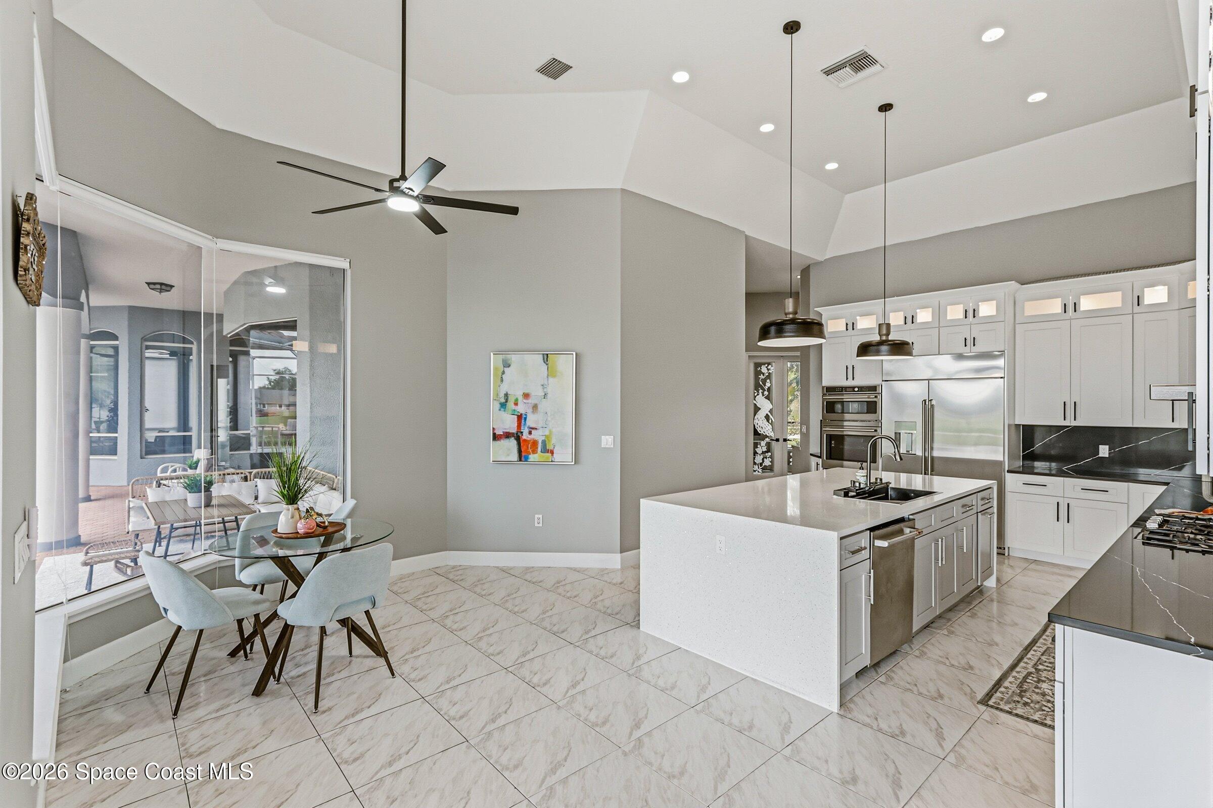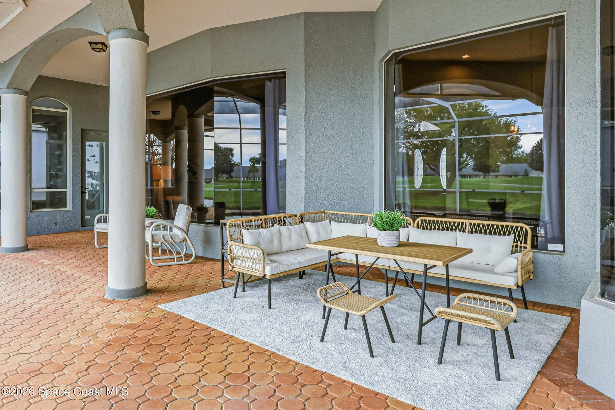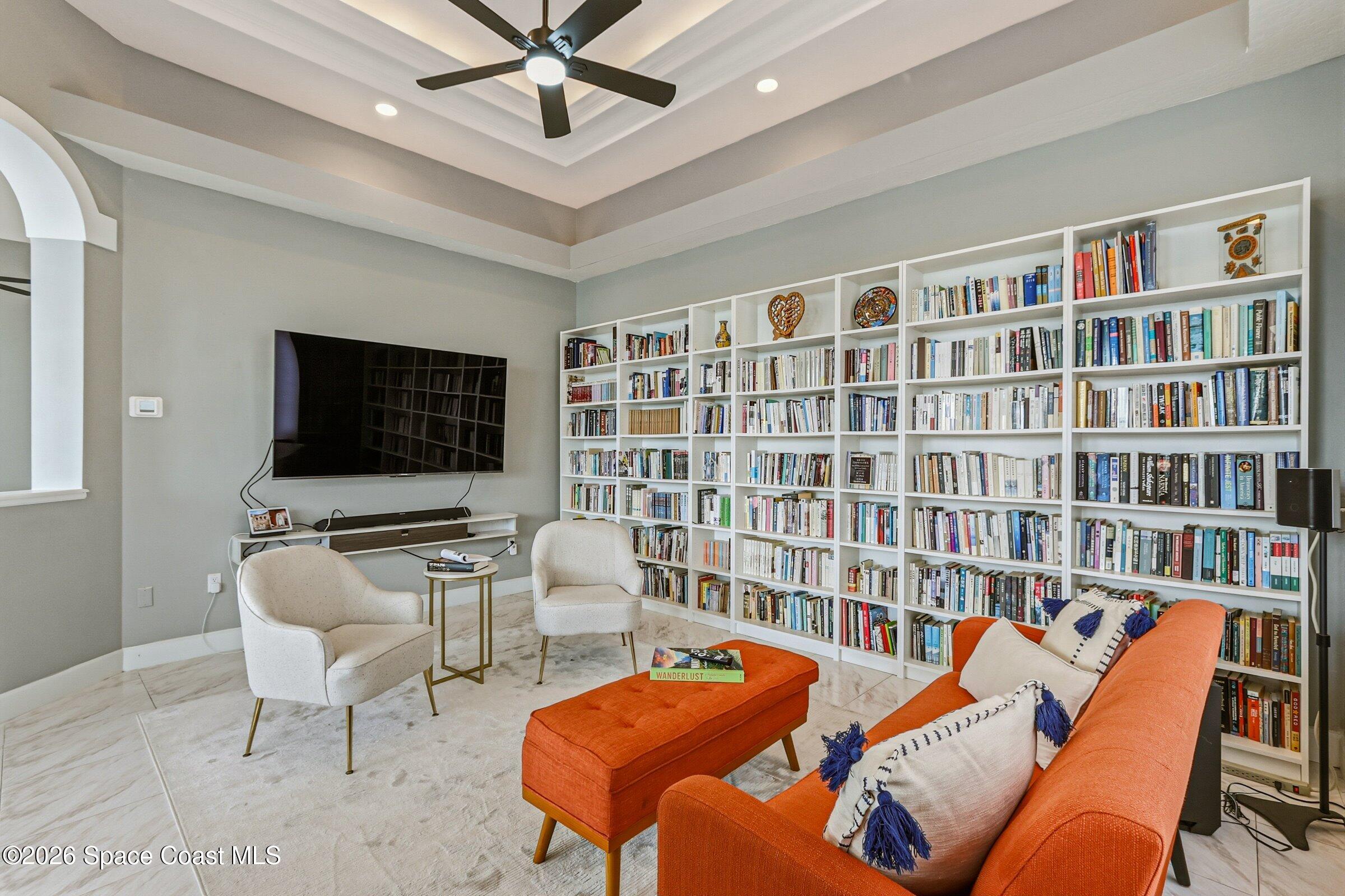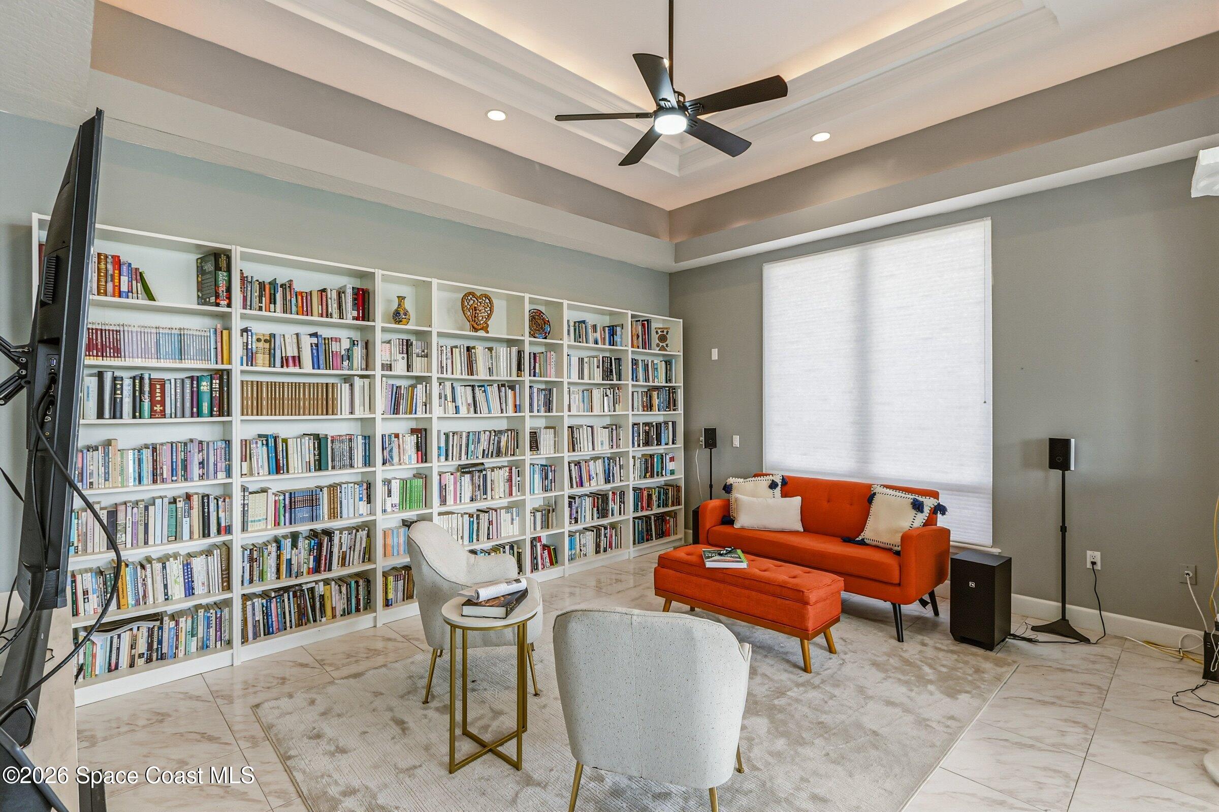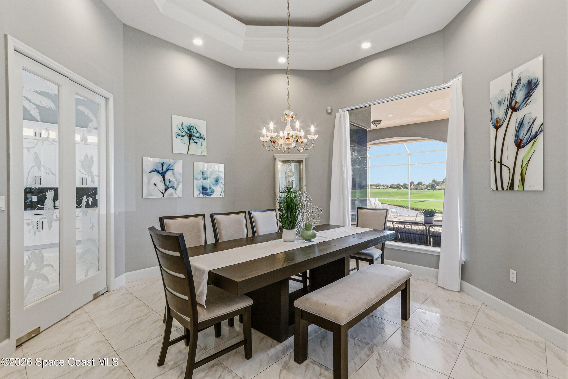 Discover an extraordinary lakefront estate in the Legends at Suntree. Offering 4,449sq ft of refined living space with sweeping views of Arnold Palmer Challenge Golf course.5 bedroom 3.5 bath residence blends grand scale with elegant design. Beginning with a dramatic 16' foyer and soaring 12-14' ceilings throughout accented by tray ceilings in the primary suite, living, family and dining rooms this home is designed for both sophisticated entertaining and everyday comfort. The home features a private library, media room and open living flow that captures stunning water and fairway vistas. The chef kitchen is beautifully appointed with quartz countertops a striking waterfall island and GE Cafe appliances. The luxurious primary suite offers a slipper tub, oversized walk-in shower and expansive his and hers closets. Outdoors a resort style pool and screened lanai overlook the tranquil lake and golf course scenery, completing this exceptional three-car garage estate.