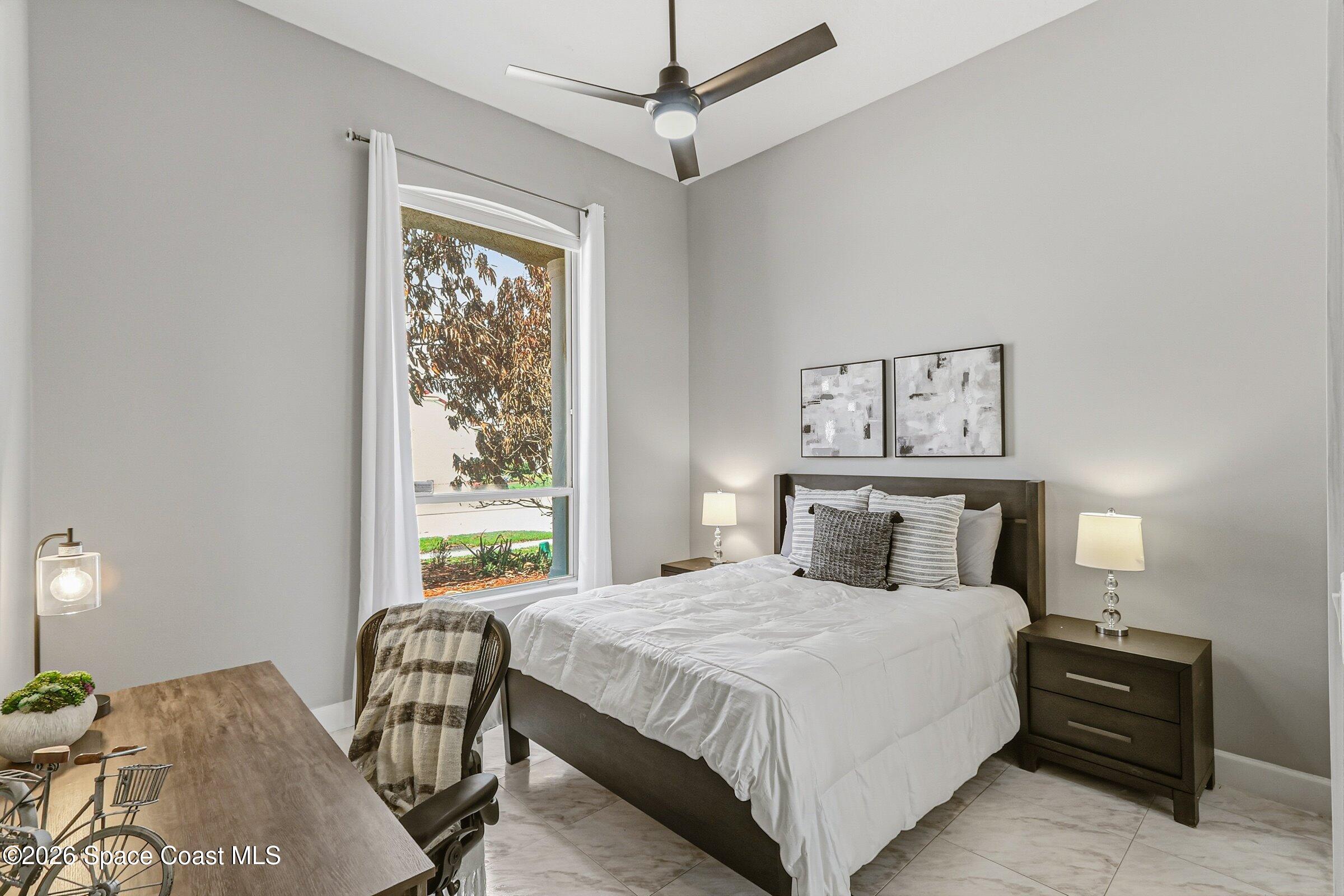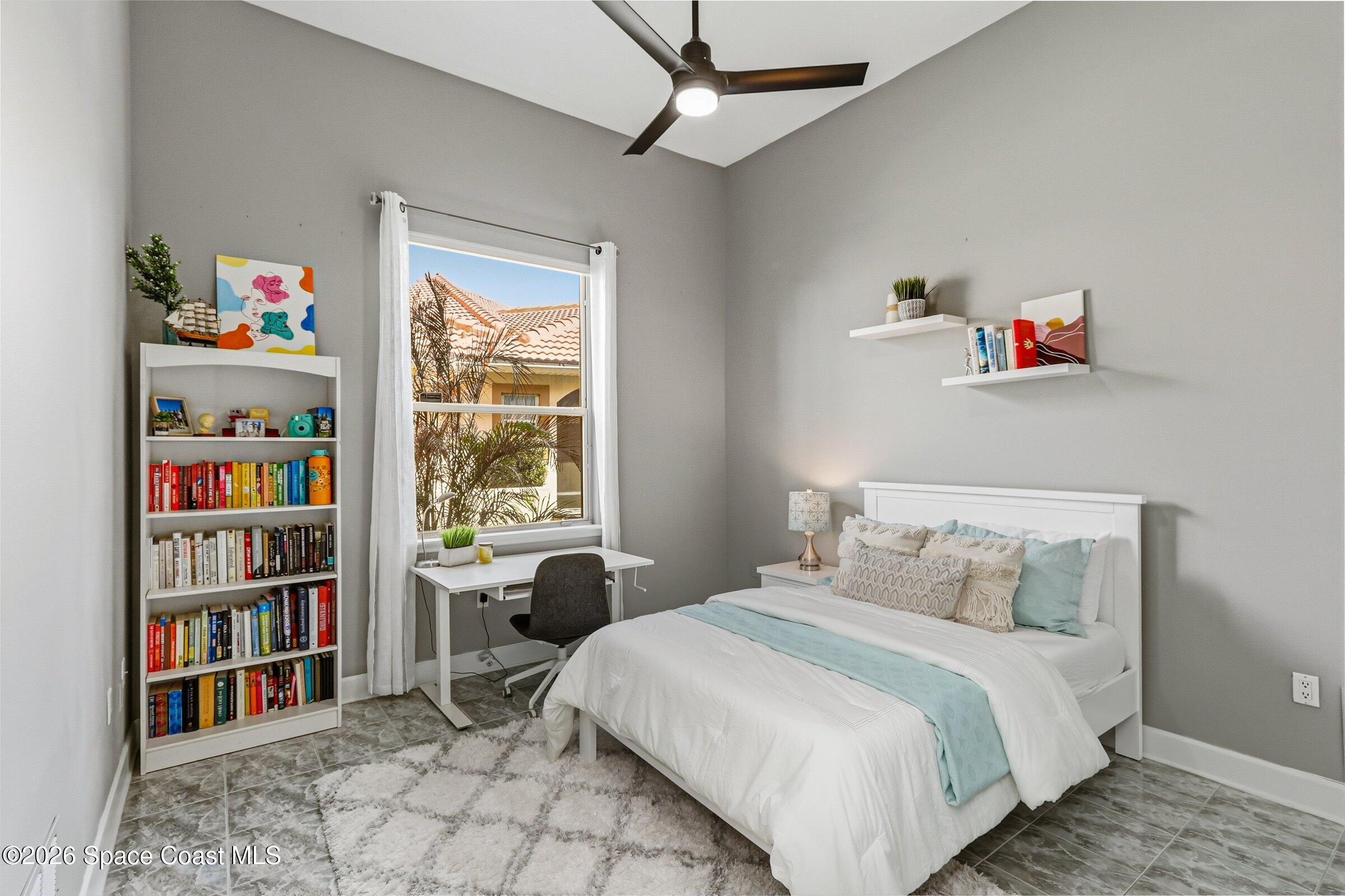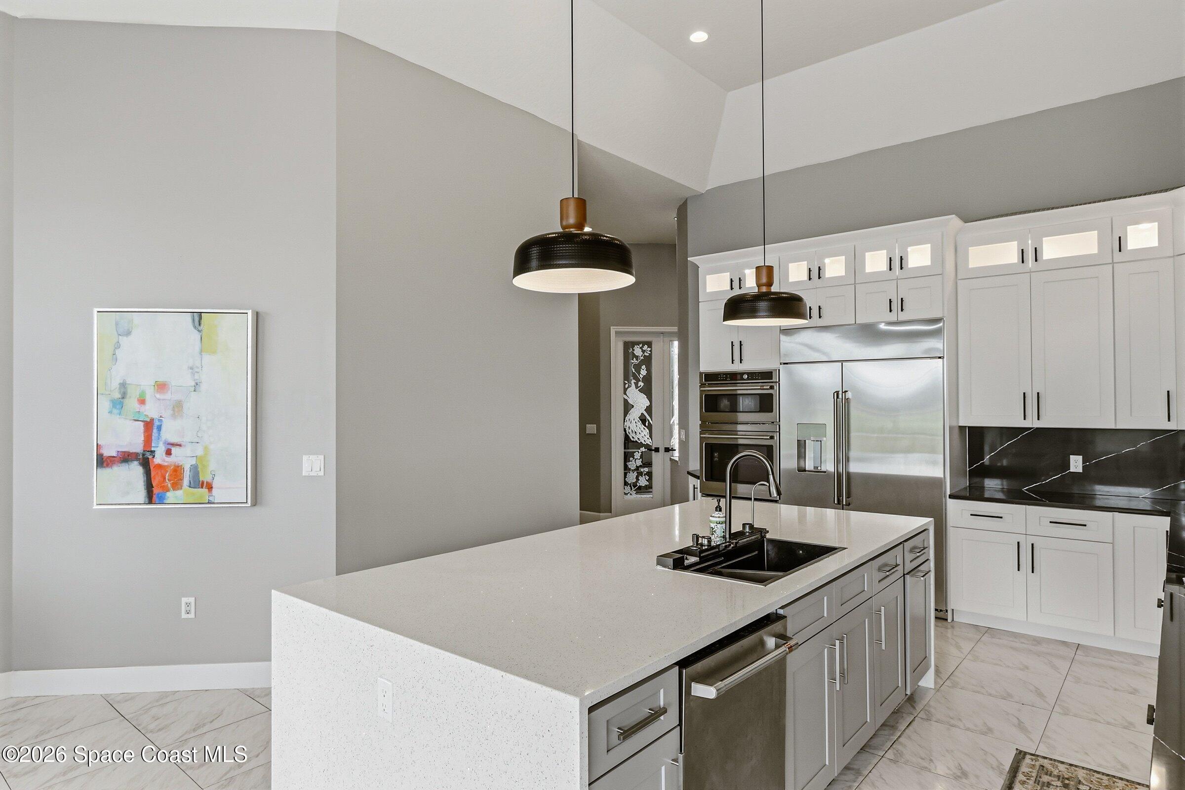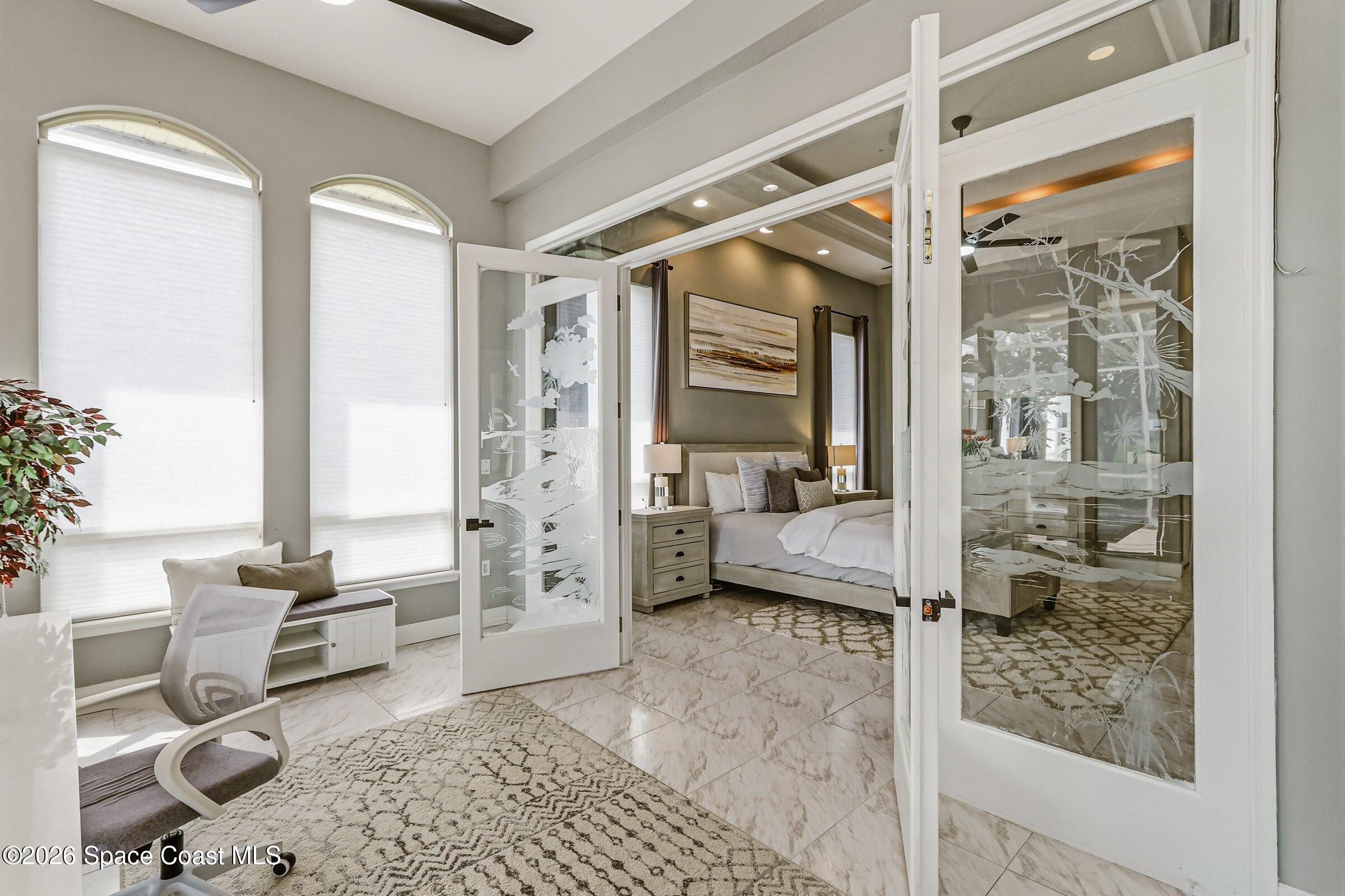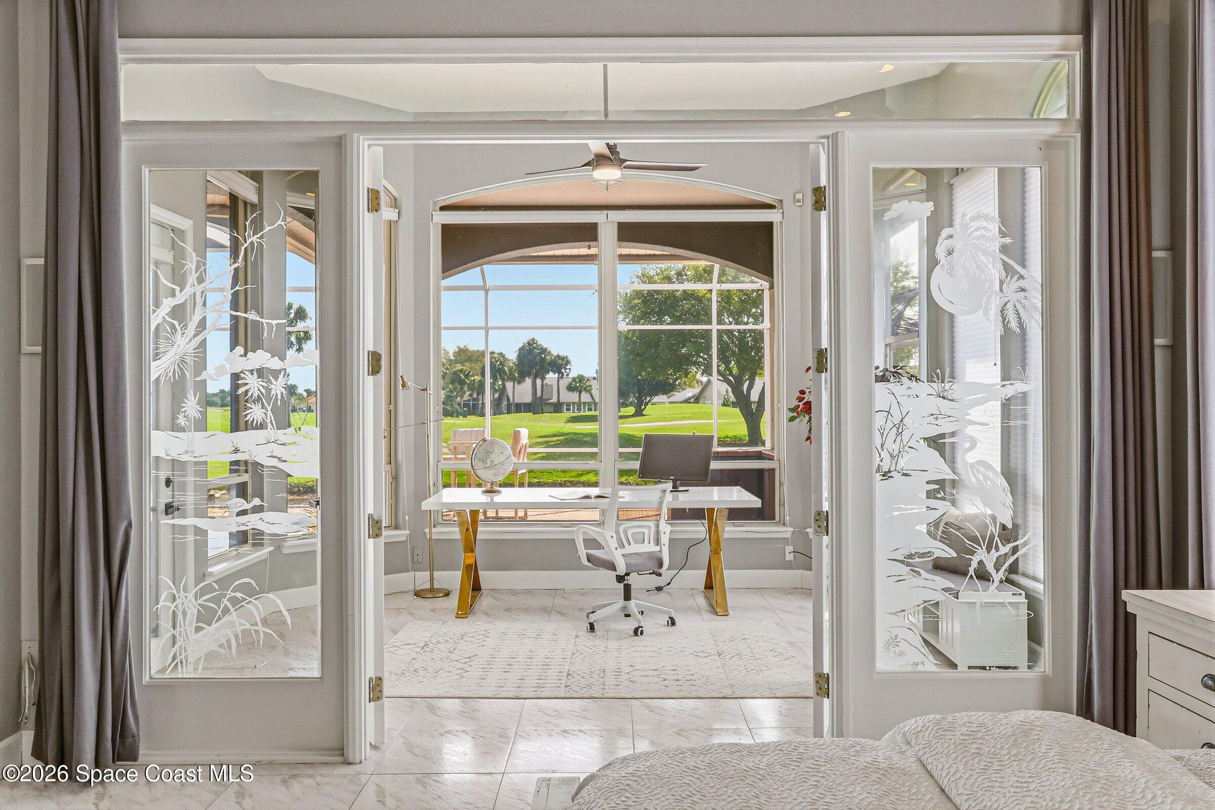 Discover an extraordinary lakefront estate in the Legends at Suntree. Offering 4,449sq ft of refined living space with sweeping views of Arnold Palmer Challenge Golf course.5 bedroom 3.5 bath residence blends grand scale with elegant design. Beginning with a dramatic 16' foyer and soaring 12-14' ceilings throughout accented by tray ceilings in the primary suite, living, family and dining rooms this home is designed for both sophisticated entertaining and everyday comfort. The home features a private library, media room and open living flow that captures stunning water and fairway vistas. The chef kitchen is beautifully appointed with quartz countertops a striking waterfall island and GE Cafe appliances. The luxurious primary suite offers a slipper tub, oversized walk-in shower and expansive his and hers closets. Outdoors a resort style pool and screened lanai overlook the tranquil lake and golf course scenery, completing this exceptional three-car garage estate.